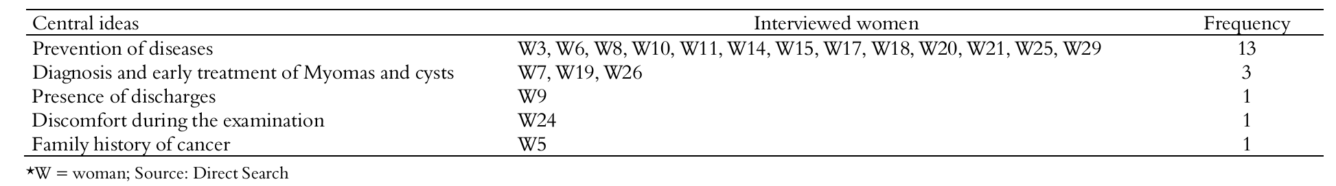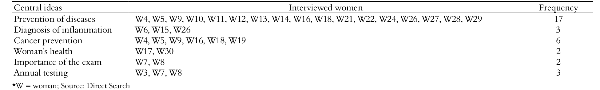 In order to obtain the empirical material, interviews were carried out and recorded in a reserved room in the BHU, with closed door, good lighting and ventilation, and the presence of researchers only, on Tuesdays and Thursdays, 2:00 p.m. to 5:00 p.m., from August to October 2016. These interviews were transcribed in full-length and guided by a semi-structured script composed of three questions to meet the objective of this research: "1. In your opinion, what does the Pap smear test mean?", "2. What reasons led you to go to the health facility to do this test?" "In your opinion, how does cervical cancer is prevented?" In order to characterize the participants, a form was applied to collect socioeconomic and reproductive data. Among the 30 participants, 14 were married, with an average age of 30 years, 22 were Catholic and 16 declared to be "housewives". Regarding the schooling level, 12 had completed high school and six had incomplete elementary education. In relation to family income, 20 reported having an income between one and two minimum wages. With regard to reproductive characterization, twelve full years were the age of first menstruation reported by seven of the women interviewed, 23 reported having children (20 of these had the first pregnancy over 15 years of age). Regarding contraceptive pills, 18 used them at present or had already used in the past, and among these, five have been using them for less than five years.