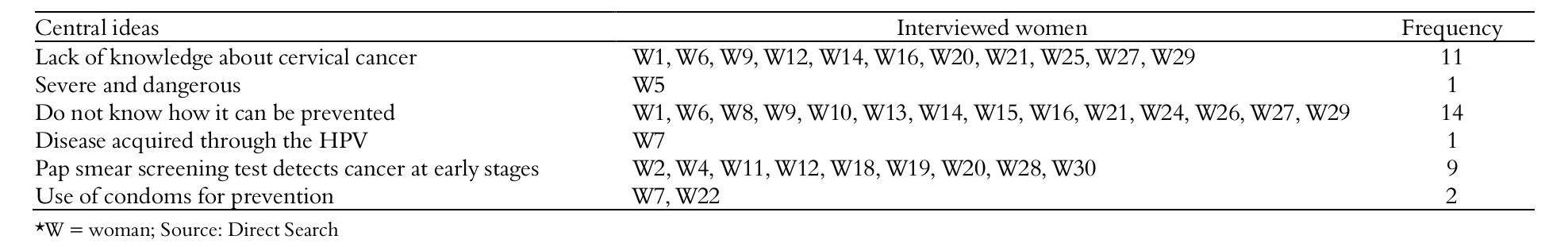 A central idea that was highlighted was that HPV contamination can cause CC, but this was mentioned by only one interviewee. Little information regarding the relationship between HPV and CC may be related to the development of risk factors for HPV as well as reduced adoption of strategies to prevent cervical cancer.