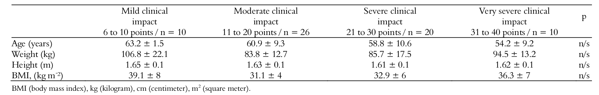 Through the implementation of the CAT, we sorted subjects into four groups according to the following score: (1) with COPD mild clinical impact (6 to 10 points), (2) moderate clinical impact (11 to 20 points), (3) severe clinical impact (21 to 30 points) and (4) very severe clinical impact (31 to 40 points).
