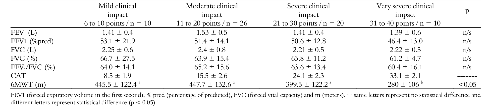 There was no association between CAT and 6MWT, since there was no significant correlation. We found that the patients of the CAT group of severe clinical impact had the shortest walking distance in the 6MWT. In the mild, moderate and severe clinical impacts the walking distance in the 6MWT did not differ between the groups. However, the 6MWT average was 48.2 meters lower in the severe clinical impact group when compared with the moderate one.