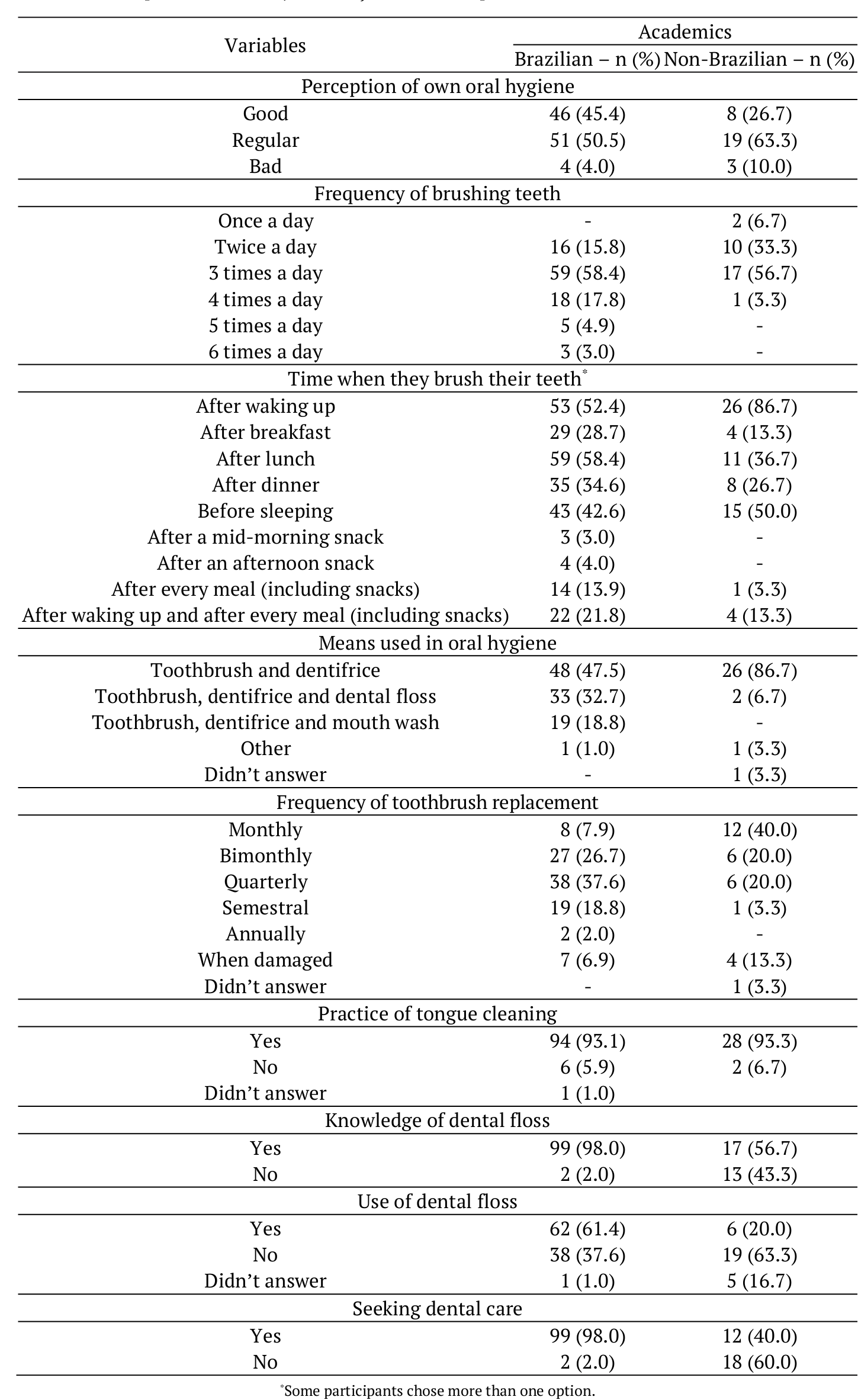 However, this study provided insight on habits and behavior in oral health of Brazilian and non-Brazilian academics recently admitted to university, offering guidance in decision-making for managers and health professionals regarding actions that can be undertaken to promote oral health and prevent pathologies in this community, respecting cultural differences.