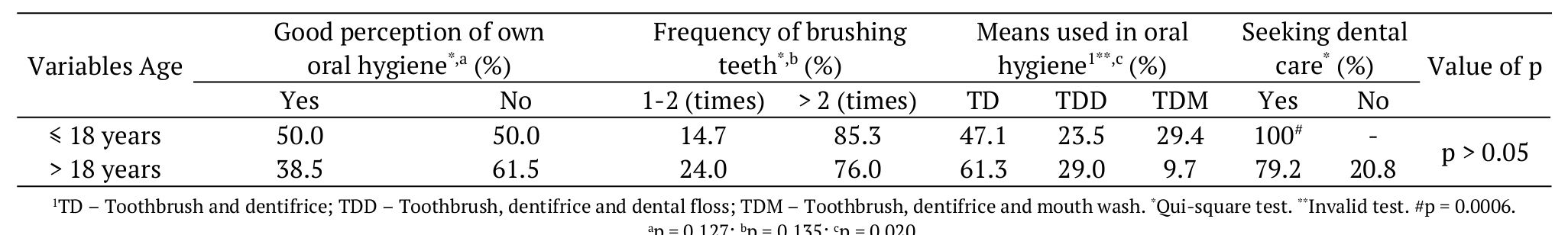 As for the association between age, perception of oral hygiene, habits and behavior in oral health (Table 2), there wasn’t a significant connection between these variables among Brazilian or non-Brazilian participants. However, considering the total number of participants, we observed a significant connection between age lower than or equal to 18 years and seeking dental care (p = 0.0006).