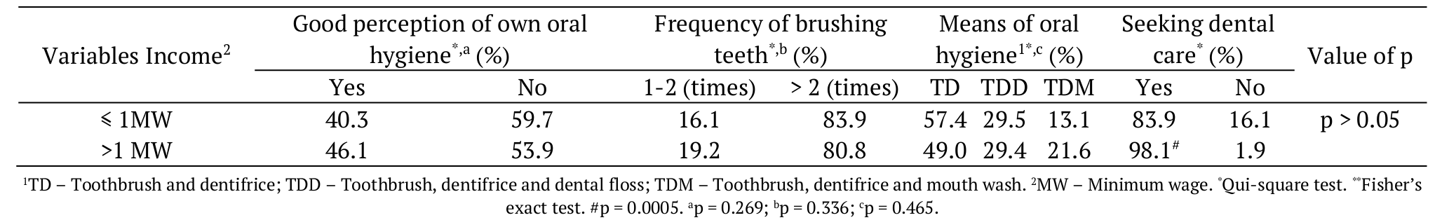 Concerning the connection between family income, perception of oral hygiene, habits and behavior in oral health (Table 3), we did not observe an association between these variables among Brazilian or non-Brazilian students. However, considering the total number of participants, we observed significant connection between students with income higher than 1 minimum wage and seeking dental care (p = 0.0005).