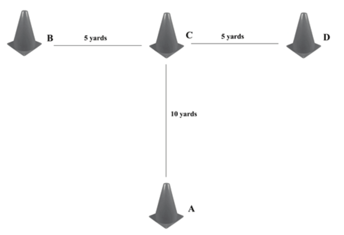 The T-Test was administered using a version standardized from previous literature (Miller, Herniman, Ricard, Cheatham, & Michael, 2006). The units of measurement were changed from yards to meters, creating a 10 × 10 m course. The course procedure of having the participant touch each cone is not standardized in the literature; therefore, the task was eliminated. The directions adopted for this study were based on Miller et al. (2006). On the ‘go’ command, the participant (1) ran or moved as quickly as possible forward to the center cone, (2) sidestepped to the right 5 m to the right cone, (3) sidestepped to the left 10 m to the far-left cone, and then (1) sidestepped back to the right of the center cone (Figure 1). The participant then ran or moved backward as quickly as possible to cross the finish line.