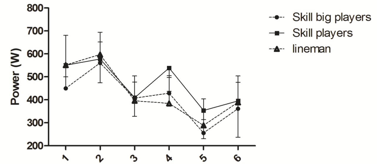 However, positional correlations between ability tests and RAST indices presented distinct results between groups. Big skill players presented great to a nearly perfect correlation between T agility test and horizontal jump scores with several power indices computed during RAST. The 10, 20 and 30 m sprint speed showed large correlation with power reduction index. On the other hand, in skill players group, a significant very large correlation was only seen between 30 m sprint speed and peak power output. Additionally, in lineman players group, a significant negative correlation was noticed on T agility test and peak speed, mean speed, mean power, mean power per weight and anaerobic capacity, respectively. This is due to the relative increased upper body demands of lineman during position-specific drills and gameplay. Much of the power and strength for these players come from the lower body (Nuzzo, 2015); however, the transfer of this strength and power occurs through the upper extremities and is typically imparted to the opponent through the arms.