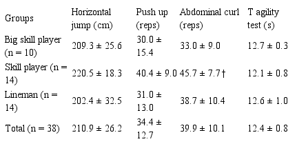 The purpose of this study was to investigate the association among anthropometric and physical performance parameters in Brazilian American football athletes and to determine if the relationship between various anaerobic indices of RAST and physical performance skills are dependent upon position. No difference was found between groups for anthropometric, horizontal jump, push up, T agility, 10, 20, and 30 m sprint speed tests and all anaerobic indices computed. However, higher abdominal curl performance was observed under skill player versus big skill player group. The skills abilities as t-test agility score, horizontal jump and 10, 20 and 30 m sprint speed showed different relationship between groups when associated with the anaerobic indices computed during RAST test.