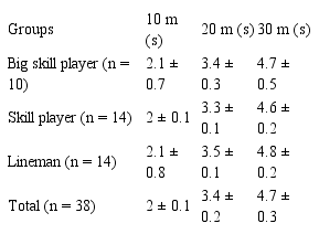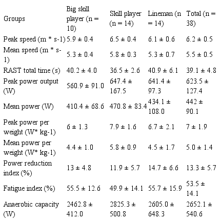 Abstract: The purpose of this study was to investigate the association between anthropometric (height and weight) and physical parameters in Brazilian football athletes and to determine if the relationship between various anaerobic indices of running anaerobic sprint test (RAST) and physical performance are dependent upon position. The present study is an observational, randomized cross-sectional research, where thirty-eight players (24.7 ± 3.9 years) performed a series of tests that consisted of physical fitness (horizontal jump, abdominal curl, push up, 10, 20 and 30 m sprint speed), anthropometric and RAST assessments. The players were classified into three groups: skill players (n = 14), big skill players (n = 10), and linemen (n = 14). One-way ANOVA followed by Bonferroni test presented no difference between groups for anthropometric, horizontal jump, push up, T agility, 10, 20, and 30 m sprint speed tests and all anaerobic indices computed (p > 0.05). However, higher abdominal curl performance was noted under skill player versus big skill player group (p = 0.045). In big skill players group, the relationship between 10, 20 and 30 m sprint speed and muscle power reduction index was great. In conclusion, the results of the current study indicated that only agility and sprint tests presented an association with the anaerobic performance for all group analyzed.