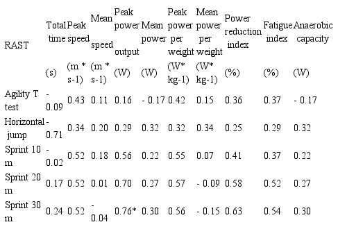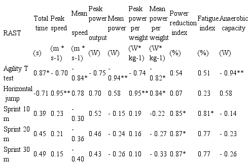The relationships between T agility test, horizontal jump, and sprint speed tests score and RAST indices range in general between trivial and moderate (Table 6). A significant very large correlation was only noted between 30 m sprint speed and peak power output.