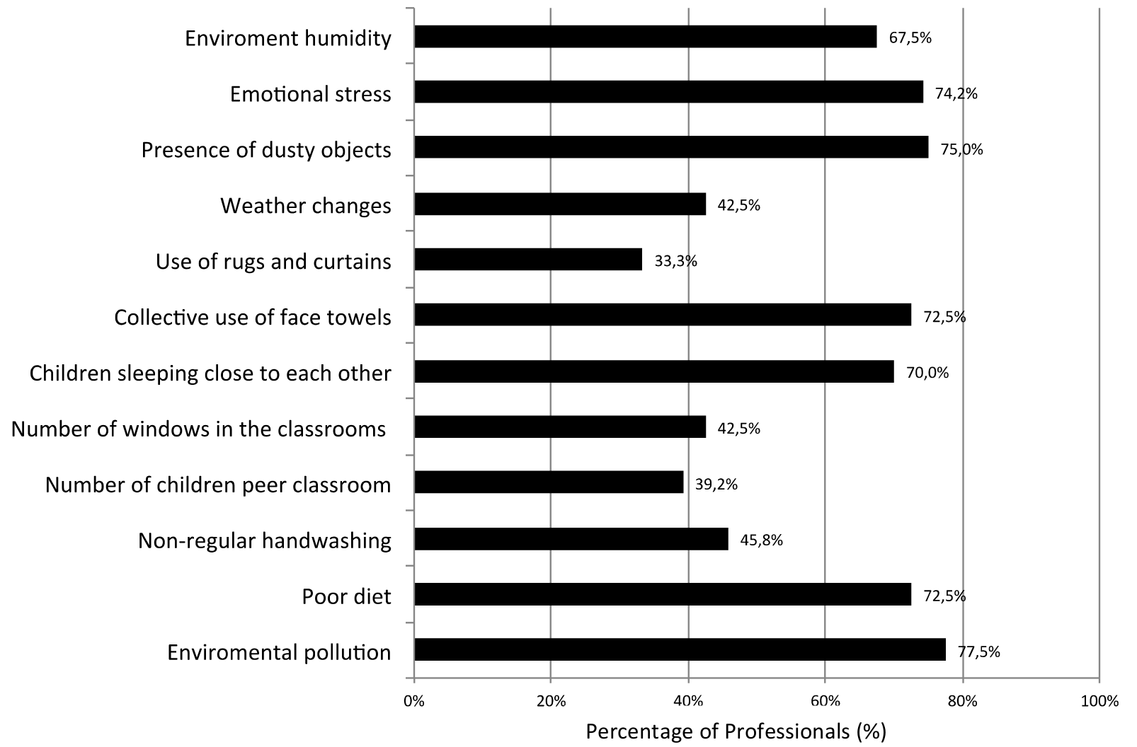 Figure 1 displays the attitudes most frequently checked by the professionals as contributors to the onset of ARIs in preschool children. The options mistakenly considered as risk factors for acquisition of respiratory infections were: number of chairs and desks per classroom (42.5%), excessive cleaning of school environment (29.2%), well ventilated classrooms (20.8%) and presence of trash cans in the classrooms (11.7%).