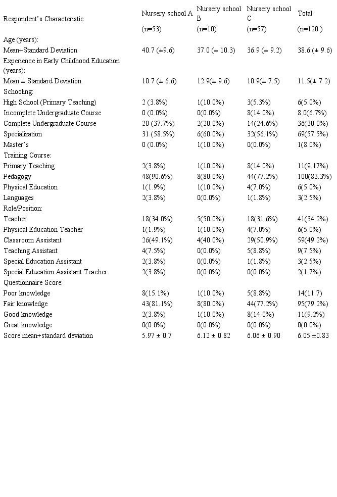 The sample was composed of 120 early childhood education professionals, 53 of which were employees from nursery school A, 10 from nursery school B, and 57 from nursery school C, all females (100%) aged on average 38.6 ± 9.6 years old, with average time working in early childhood education of 11 ± 7.2 years. Schooling level, training course, current job and questionnaire score are displayed in Table 1.