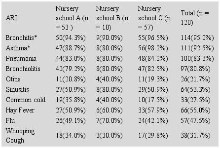 The following ARIs were mentioned, in the three nursery schools, as being the most frequent ones: bronchitis first (81.7%), then asthma (40%) followed by bronchiolitis (35.8%).