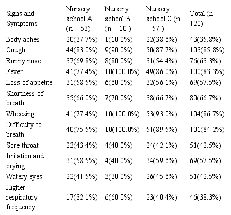 The ARI-related signs and symptoms checked most frequently were cough (41.7%), diarrhea (5.8%) and rhinorrhea (1.7%). The most serious signs and symptoms referred to by the educators were fever (55.8%), difficulty to breath (50.0%) and shortness of breath (37.5%).