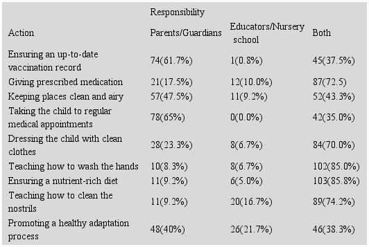 The actions considered by the professionals as able to reduce the risks of a child acquiring ARIs in nursery school are: handwashing (90.0%); use of paper towels (83.3%); presence of pillows and mattresses in airy places (81.7%); provision of a nutrient-rich menu (79.2%); use of individual bed sheets, blankets (70.0%) and clean clothes (60.8%); use of individual pacifiers (60.0%); washing toys with water and soap (57.5%); sun bathing (55.0%); use of individual combs and toothbrushes (53.3%); keeping playgrounds clean and free of objects that accumulate water (51.7%).