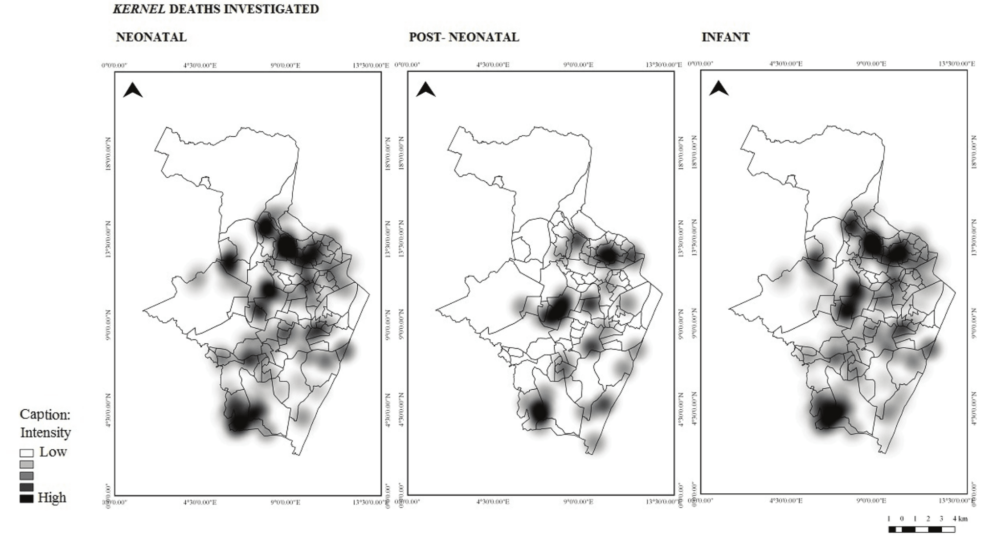 Abstract: To describe the occurrence and spatial distribution of infant deaths investigated by surveillance in Recife, state of Pernambuco, Brazil, in 2014. This is an exploratory ecological study investigating 183 infant deaths. Data from the confidential records of surveillance investigation of the infant death and the Mortality Information System were used. In order to detect spatial distribution patterns, the kernel estimation of infant, neonatal and post-neonatal mortality was used. Deaths were mainly of the neonatal type (n = 144; 78.69%), with gestational age below 37 weeks (n = 147; 80.3%) and birth weight lower than 2500 g (n = 143; 78.1%). The main causes of infant deaths were the disorders originating in the perinatal period, with emphasis on maternal hypertensive disorders (n = 31; 16.9%). The kernel map showed a higher density in 12 neighborhoods of the North (4), Northwest (2), West (3) and South (3) regions of the municipality. It was found a heterogeneous pattern in the occurrence and distribution of deaths in the territory; spatial clusters were observed in several areas of Recife with similar geographic spaces between types of death.