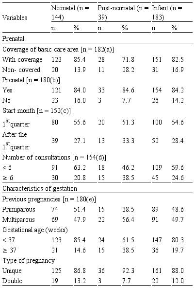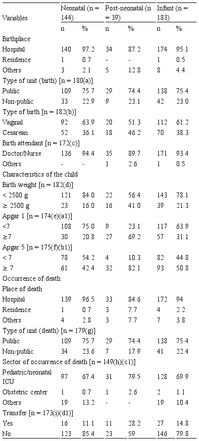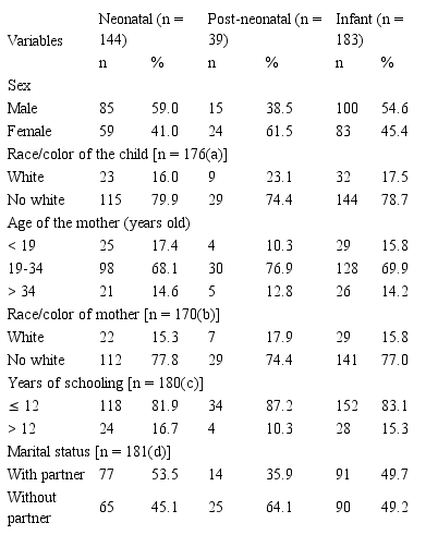 Of the 183 infant deaths investigated, the majority occurred in the neonatal period (n = 144; 78.7%), the highest proportion of deaths was for males (n = 85; 59.0%), while in the post-neonatal period the female sex predominated (n = 24; 61.5%). Mothers were mainly between 19 and 34 years old (n = 128; 69.9%) and had less than 12 years of schooling (n = 152; 83.1%) (Table 1).