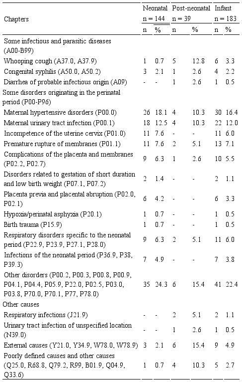 The main causes of infant deaths were disorders originating in the perinatal period, with emphasis on maternal hypertensive disorders (n = 31; 16.94%), especially in the neonatal period (n = 26; 18.1%), and maternal urinary tract infections (n = 22; 12.0%), especially in neonatal deaths (n = 18; 12.5%). In the post-neonatal period, external causes (probably bronchoaspiration) were among the highest frequencies (n = 6; 15.4%), followed by whooping cough (n = 5; 12.8%), which is in the chapter on infectious and parasitic diseases. Despite the low frequency (n = 4; 2.2%), congenital syphilis also stood out out (Table 4).