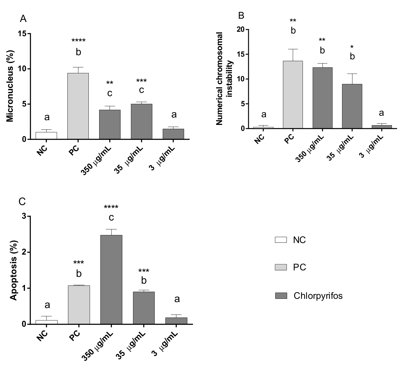 Abstract: Chlorpyrifos (CPF) is an organophosphate widely marketed as a pesticide. However, only few studies have investigated its genotoxic potential, especially in human tissues or cells, or the minimal concentration capable of inducing damage. This study analyzed the in vitro genotoxic potential of CPF in cultured human leukocytes at concentrations of 3, 35, and 350 μg mL-1. Results demonstrated that the two highest concentrations exhibited an increase (~2-fold) in the micronucleus frequency (p < 0.01), the number of numerical chromosomal instabilities (~10–12 times, p < 0.05), and the number of apoptotic cells (~10- to 20-fold, p < 0.001). These results demonstrate the genotoxic potential of CPF and could open new discussions regarding its safety and toxicology.