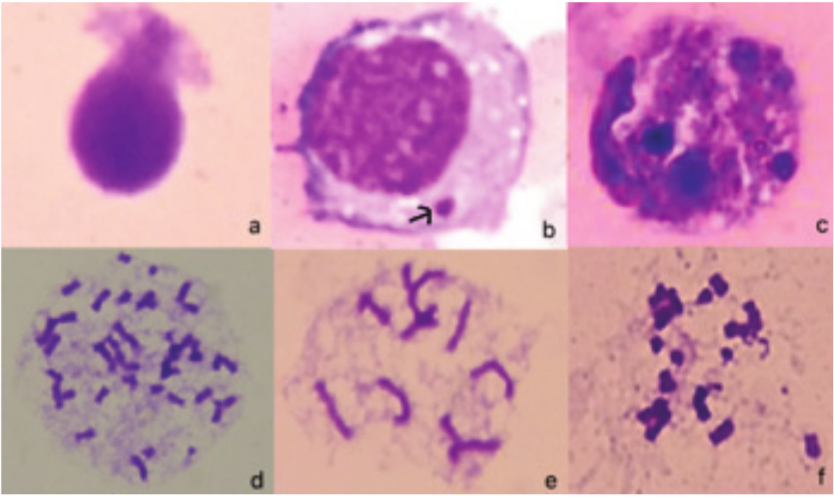 Figure 2 shows a normal leukocyte and a leukocyte with cellular alterations with or without exposure to CPF. First, from right to left, a normal lymphocyte is shown (Figure 2a). Then, a lymphocyte after exposure to CPF is shown presenting a micronucleus as indicated by the arrow (Figure 2b). An apoptotic leukocyte (after exposure to CPF) is shown with the following characteristics: nucleus undergoing pyknosis, collapsed and with deep wrinkles with dense chromatin in a hooded form, presence of apoptotic corpuscles, cytoplasm bubbles, and membrane integrity (Figure 2c). Finally, a leukocyte with a normal chromosome number in the mitotic process (Figure 2d) and two leukocytes exposed to CPF having a chromosome count well below normal are shown (Figures 2e-f).