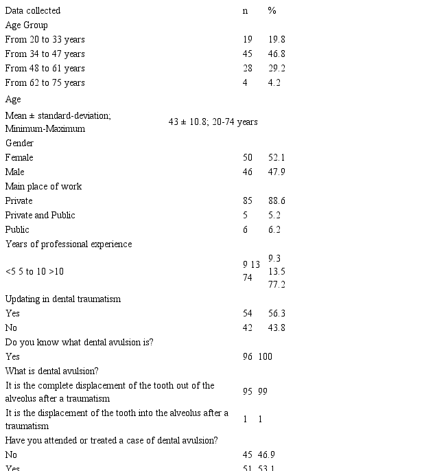 Therefore, the aim of this study was to evaluate the knowledge of dentists in the city of Maringá, State of Paraná, Brazil, relative to the urgency conduct of avulsed teeth. Thus, the null hypothesis tested was that there is lack of knowledge by dentists relative to the procedures to be adopted in cases of dental avulsion.