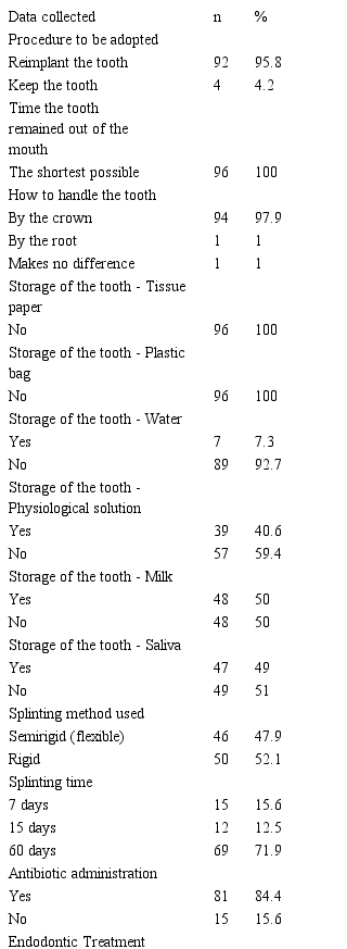The professionals’ knowledge about the procedure to be adopted in cases of tooth avulsion is presented in Table 2. The authors point out that 4.2% responded that the tooth should be kept; one professional, that the avulsed tooth should be handled by the root, and another, that it made no difference how it was handled. Also worth mentioning is that around half of the professionals responded that the avulsed tooth must not be kept in milk or saliva; and over half of the professionals responded that rigid splinting was the ideal, and around 72% would use it for 60 days.