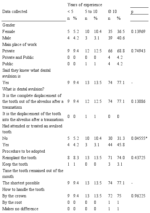 When the years of experience were associated with some of the data collected, the majority of the professionals had over 10 years of experience and the authors observed that the association with attendance in cases of tooth avulsion was positive (p = 0.04555), as presented in Table 3.