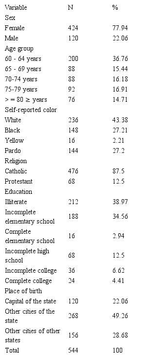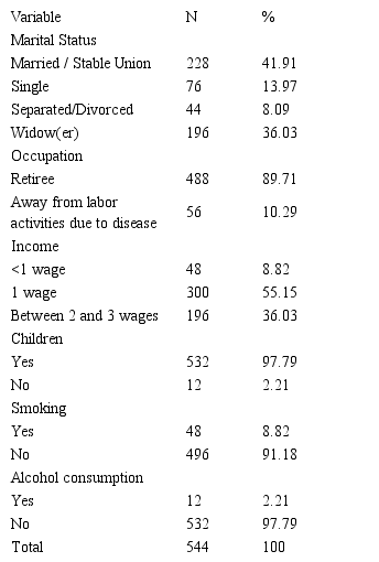 According to data from the Basic Healthcare Information System, there are 2,789 elderly people enrolled in the unit chosen for the development of the research. The sample was composed of 544 elderly patients with confirmed medical diagnosis of Systemic Arterial Hypertension, participating in the HIPERDIA Program.