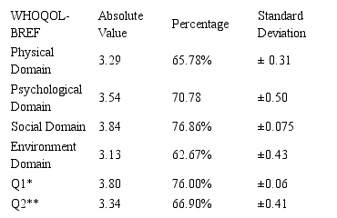 The QOL measured by the WHOQOL-BREF obtained higher scores in the Social relationships Domain (76.86%) and lower scores in the Environment Domain (62, 67%), according to Table 3.