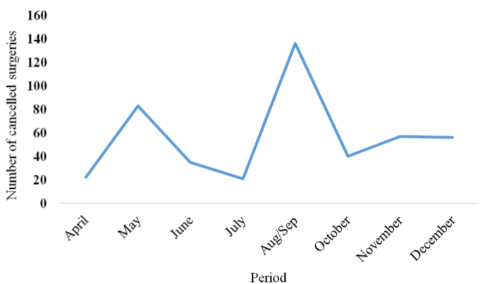 As for seasonality, April and July were the months that presented the smallest number of cancelled surgeries, with 4.8% (22), while the peak happened in August/September, with a total of 30.1% (137), followed by May, with 18.5% (84) of all cancellations (Figure 1).