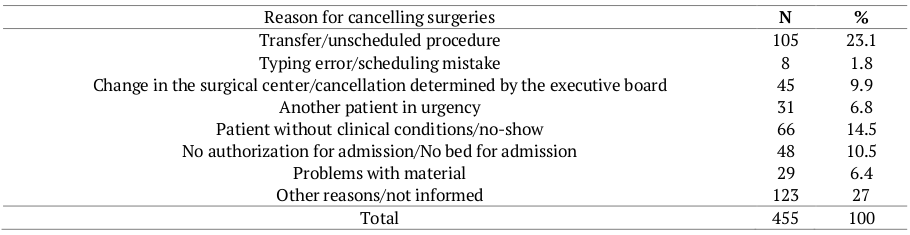 A total of 455 surgeries were cancelled throughout the period from April to December 2017, accounting for 8.1% of all procedures. The causes for cancelled surgeries of greatest prevalence were unreported reasons (27%), transfer/unscheduled procedure (23.1%), and patients without clinical conditions or no-show (14.5%). These data differ from those reported in a study conducted by Souza, Maurício, Marques, Mello, & Leite (2010), also in a university hospital in the city of Rio de Janeiro. In said investigation, out of the 973 postponed surgeries, the first three reasons referred to patients without clinical conditions (24.5%), lack of material (10.3%), and blank or unreported reasons (12.4%).