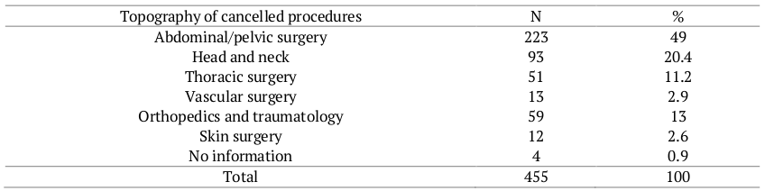 Table 2 displays the number of surgery cancellations by the topography of the procedure that would be performed. It is possible to notice a prevalence of abdominal/pelvic surgeries, with 49% (223) of all cancelled surgeries, followed by head and neck surgeries, with 20.4% (93). The lowest cancellation rates were found for skin surgeries, with 2.6% (12), followed by vascular, with 2.9% (13).