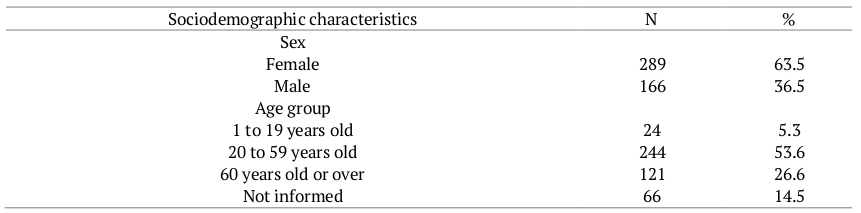 Table 3 displays the number and proportions referring to surgery cancellations, based on the patients' sociodemographic characteristics (sex, age). There was a predominance of females, with 63.5% (289) of the total, and most of the surgeries, 53.6% (244), should be performed on patients aged between 20 and 59 years old, with those aged 60 or over representing 26.6% (121) of all cancelled procedures. The age group from 1 to 19 years old presented the lowest rate of cancelled surgeries, 5.3% (24).