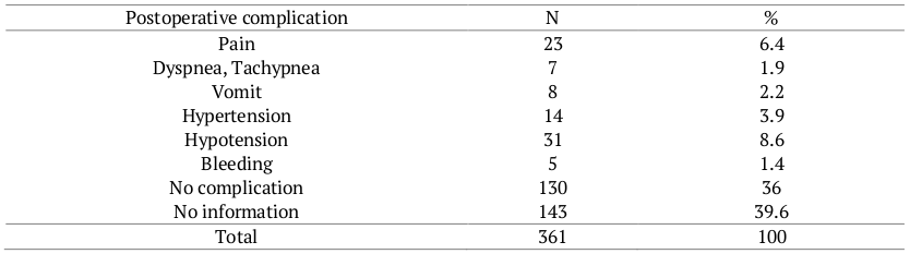 In this research, the most frequent postoperative complication was hypotension, with 8.6% (31), followed by pain, with 6.4% (23), twice the percentage reported by Caro et al. (2015) in their study.