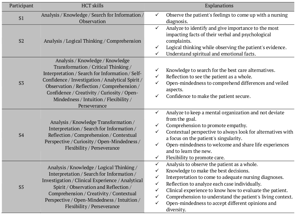 Analyzing the speeches of the students and their evaluation of the clinical case to which they applied the NDP, it was possible to bring together Table 1, displayed below, which presents the HCT skills necessary for applying the NDP, from the students' viewpoint.