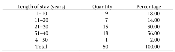Regarding the time of dwelling within the research site, the minimum was 2 years and the maximum was 50, with a median of 30 years of occupancy. Table 1 shows the descriptive analysis of the dwelling time of the elderly in the zone where the study was conducted, while Table 2 shows the longevity of these volunteers in their current residences.