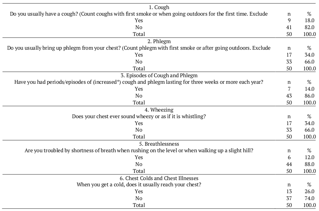 The results of the MRC-ATS-DLD78 questionnaire regarding respiratory symptoms are shown in Table 3.