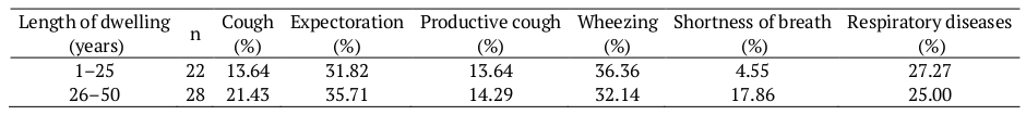 Table 5 shows the relationship between the dwelling time in years within the polluted zone covered in the research and the percentage of respiratory symptoms of the participants. Based on an average dwelling time of 25 years, it is clear that the longer the dwelling time, the more susceptible the person was to coughing, expectoration, productive cough, and respiratory diseases.