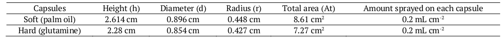 The height and diameter of the palm oil and glutamine capsules were measured using a calliper. The cylinder equation was used to predict the total area of the capsules, thus estimating the amount of coating, in mL, to be used per cm2 of capsule (Evonik, 2016; Soares et al., 2018).