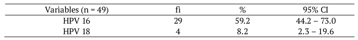 With the use of the generic primers GP05/06 it was possible to identify, through PCR, HPV DNA in 100% (49/49) of the endocervical samples. The HPV 16 subtype was found in 29 (59.2%) samples through PCR with the use of specific primers for the detection of this subtype. Through PCR, the HPV 18 subtype was found in 4 (8.2%) samples, as well as 4 co-infections with the HPV 16 subtype. In the present study, the PCR molecular method proved to be effective in diagnosing the presence of specific HPV subtypes (16 and 18).