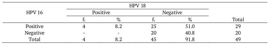 Trottier et al. (2006), analyzing the association of infection with multiple HPV subtypes in samples of 2,462 Brazilian women, found that only 3.2% had multiple infections. In the present study, there was co-infection between the two subtypes (16 and 18) in 4 (8.2%) of the samples used. This is an important finding that corroborates studies that affirm the existence of a relationship between HPV groups of high and low oncogenic potential with cell abnormalities diagnosed in the cytopathological results (zur Hausen & de Villiers, 1994; Regenmortel et al., 2000; Albring, Brentano, & Vargas, 2006).