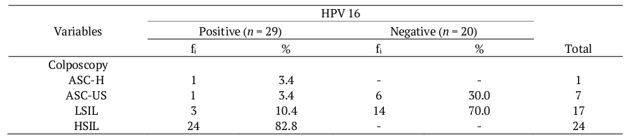 Table 3 shows the prevalence of HPV 16 according to the colposcopy examination, with only one patient (3.4%) diagnosed with ASC-H (atypical squamous cells, cannot exclude a high-grade intraepithelial lesion) and she was also infected by HPV 16. In turn, of the seven women with ASC-US (atypical squamous cells of undetermined significance), only one (3.4%) was infected by HPV 16. Of the 17 patients with LSIL (low-grade squamous intraepithelial lesion), three (10.4%) presented a positive result for HPV 16 and all 24 (82.8%) women with HSIL (high-grade squamous intraepithelial lesion) were also infected by viral subtype 16.