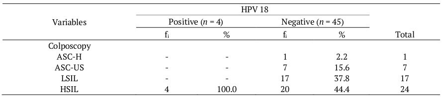 Table 4 compares the prevalence of HPV 18 according to the colposcopy examination. Only one patient (5.6%) was diagnosed with ASC-H (atypical squamous cells, cannot exclude high-grade intraepithelial lesion), and she was not infected by HPV 18, while, of the seven women with ASC-US (atypical squamous cells of undetermined significance), one was infected by HPV 18. Likewise, the tests of the 17 women with LSIL (low-grade squamous intraepithelial lesion) were negative for HPV 18. However, of the 24 women with HSIL (high-grade squamous intraepithelial lesion), 4 (44.4%) were infected by viral subtype 18.