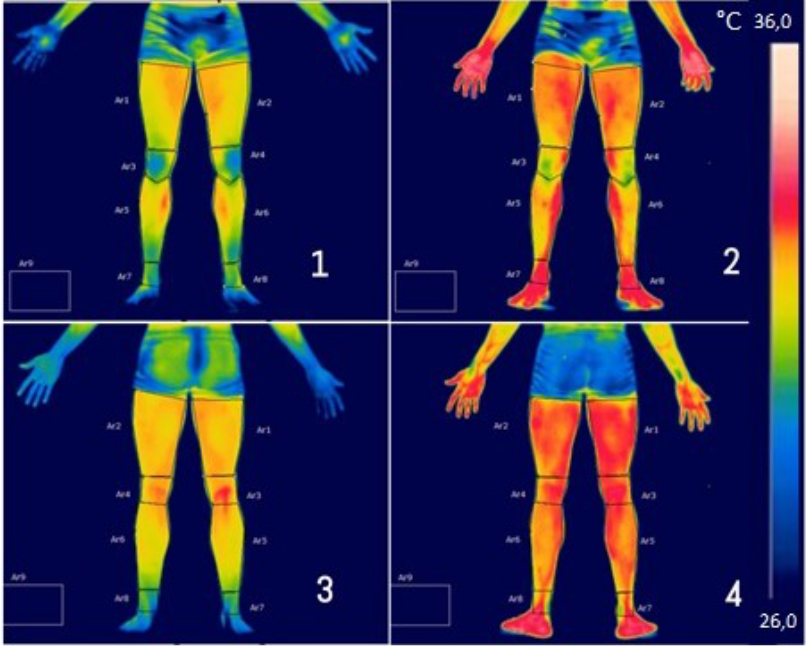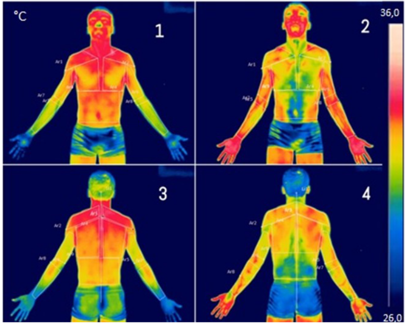 The skin temperature (Tsk) in athletes submitted to competition and training activities may be increased more than tenfold and remain elevated for several hours due to the rate of heat production (Lim, Byrne & Lee, 2008; Tanda, 2018). This increased heat production is associated with muscular work and shifts of blood flow (Hildebrandt, Raschner, & Ammer, 2010; Hildebrandt, Zeilberger, Ring, & Raschner, 2012; Lahiri, Bagavathiappan, Jayakumar, & Philip, 2012).