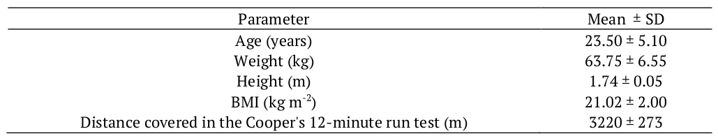 The basic characteristics of the participants are shown in Table 1. The estimated mean maximal oxygen consumption (VO2) maximum during the test was 60.68 ± 6.10 mL kg-1 min-1, and all volunteers presented a score classified as "excellent" considering the distance traveled according to age and gender.