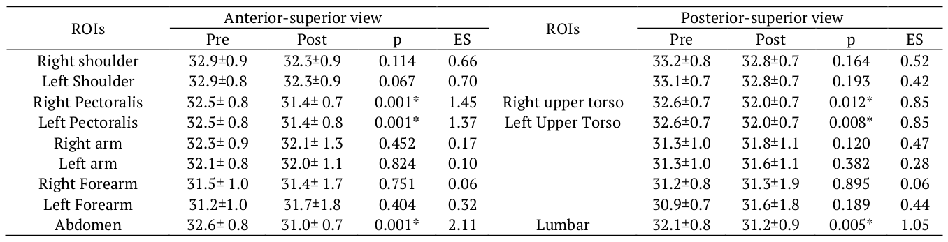 When comparing pre- and post-test values for each ROI in the anterior-superior view, a decrease in Tsk was observed for the trunk and upper limbs areas (Figure 2) in the right pectoral (-3.4%; p<0.01; d=1.45), left pectoral (-3.4%; p<0.01; d=1.37) and abdominal (-5.0%; p<0.01; d=2.11) regions. When analyzing the Tsk in the posterior-superior view, a significant decrease was found in the upper right trunk (-1.9%; p<0.01; d=0.85), upper left trunk (-1.9%; p<0.01; d=0.85) and lumbar region (-2.9%; p<0.01; d=1.05). There were no significant changes in Tsk in the other regions, as shown in Table 2.