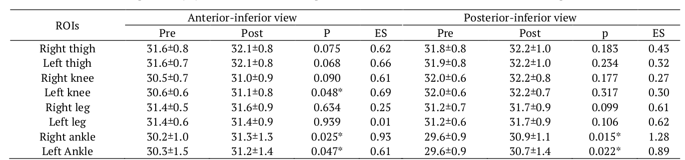 In the analysis of the lower limbs (Figure 3), a significant increase in Tsk was observed in the anterior view in the left knee (1.6%; p=0.048; d=0.69), right ankle (3.6%; p=0.025; d=0.93) and left ankle (2.9%; p=0.047; d=0.61). In the posterior view, only the right (4.3%; p=0.015; d=1.28) and left ankles (3.7%; p=0.022; d=0.89) presented a significant increase in Tsk (Table 3).