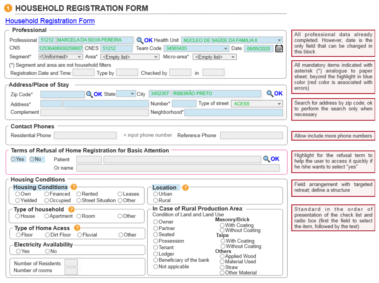 In this sense, in addition to the initial screen of the e-SUS module in the Hygiaweb System - the proprietary system in force in the municipality - screens were developed for the four forms that the CHA uses, until the present moment of the research. In addition, screens were developed referring to the same four forms, but containing suggestions of opportunities for improvement, guided by notes from the participants of this study and based on the literature.