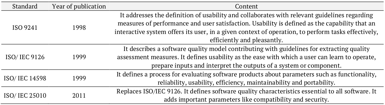 In this perspective, usability is directly related to the elements of user interaction, associating characteristics of software quality, outlined by standards such as ISO 9241, ISO/IEC 9126, ISO/IEC 14598 and ISO/IEC 25010, presented in Table 1. Consenting to be used together, the standards can be subdivided, according to their characteristics.