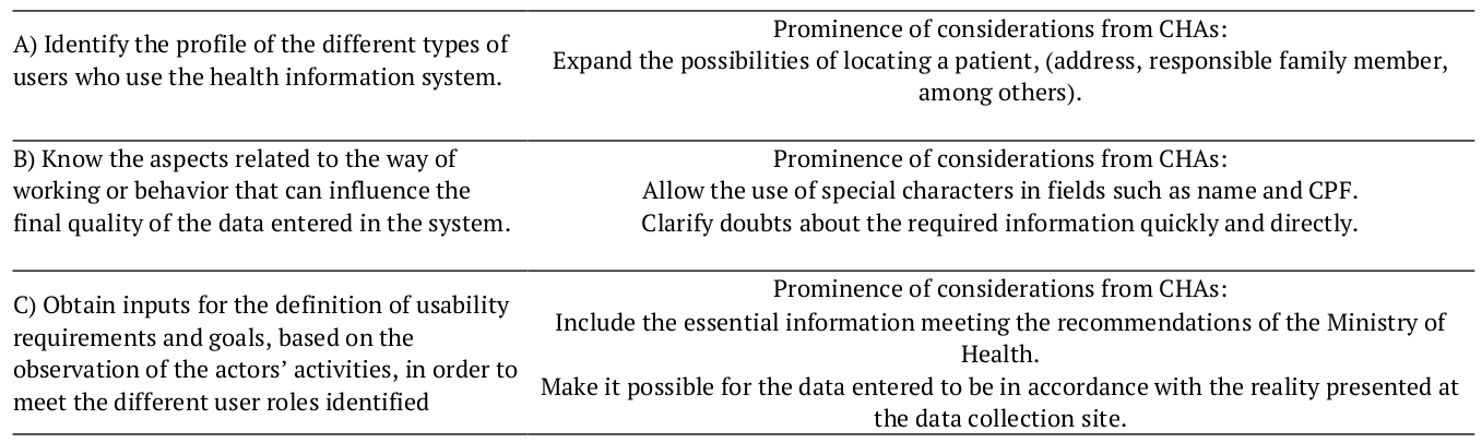 In order to characterize the relationship between Community Health Agents (CHA) and the system, aiming at appropriate solutions for the type of use expected for the product, we sought to identify the different user profiles to know aspects relevant to the way of working and, also, contribute to the verification of requirements and usability goals, as highlighted in Table 2.