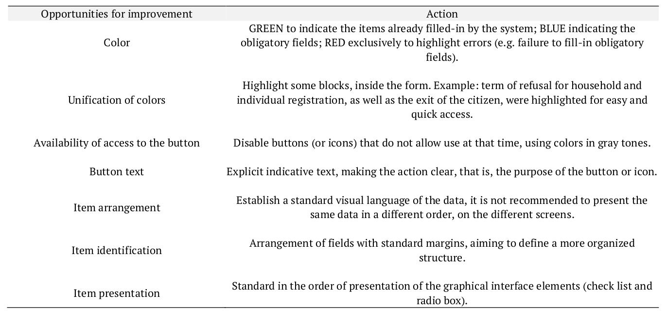 Among the suggestions of opportunities for improvement, illustrated in Figure 1, we highlight the insertion of new fields (such as including landline phone number), the provision of an information board to clarify information about the required item, through an icon of quick access characterized by a question mark; and yet, the importance of establishing a visual identity, both in the arrangement and indation of the items (items separated by a standard margin space defining a more organized structure), as well as in the benefits of using color aiming to contribute to the quality of information presentation.