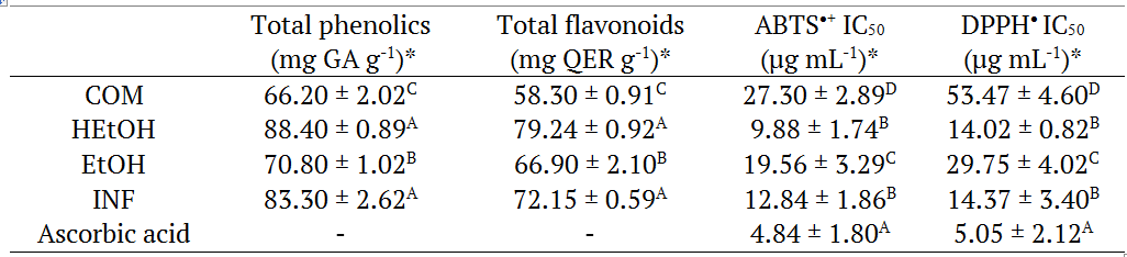 The total content of phenolics and flavonoids are observed in Table 1. It can be verified that the HEtOH and INF samples exhibited a similar content of polyphenols, being the COM sample the one with lowest polyphenols quantities.